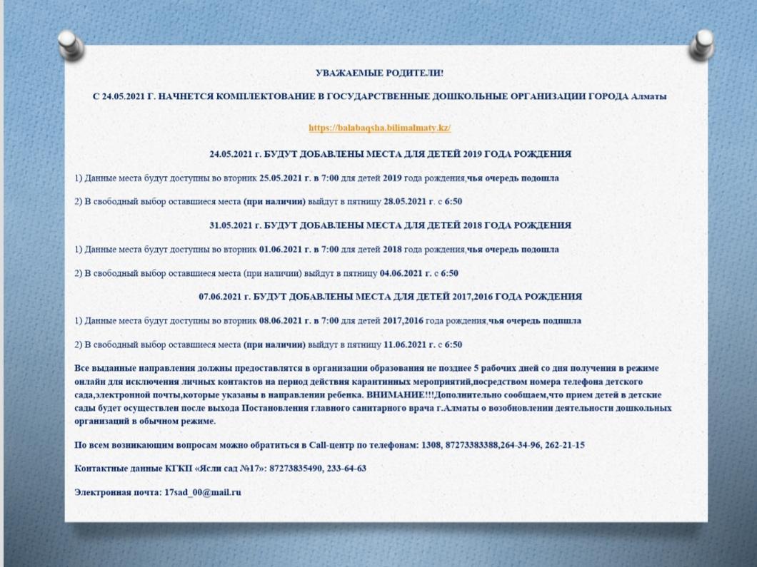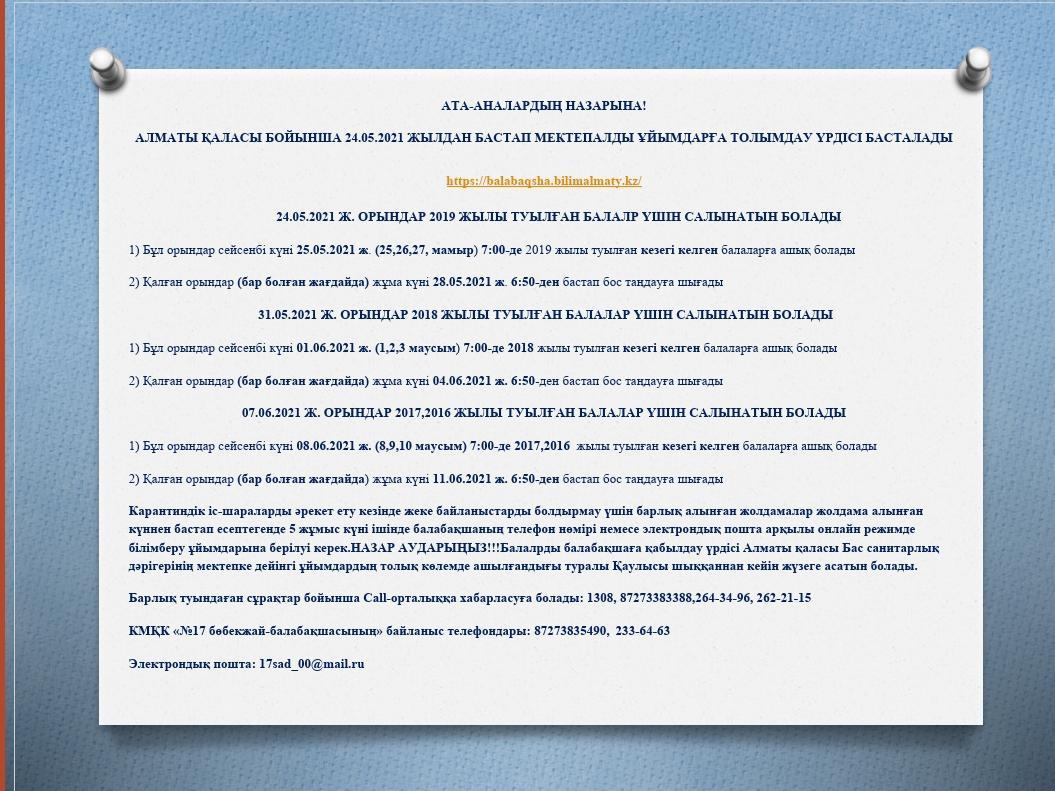 21 мамыр 2021 0 1 2 3 4 5 АЛМАТЫ ҚАЛАСЫ БОЙЫНША 24.05.2021 ЖЫЛДАН БАСТАП МЕКТЕПАЛДЫ ҰЙЫМДАРҒА ТОЛЫМДАУ ҮРДІСІ БАСТАЛАДЫ