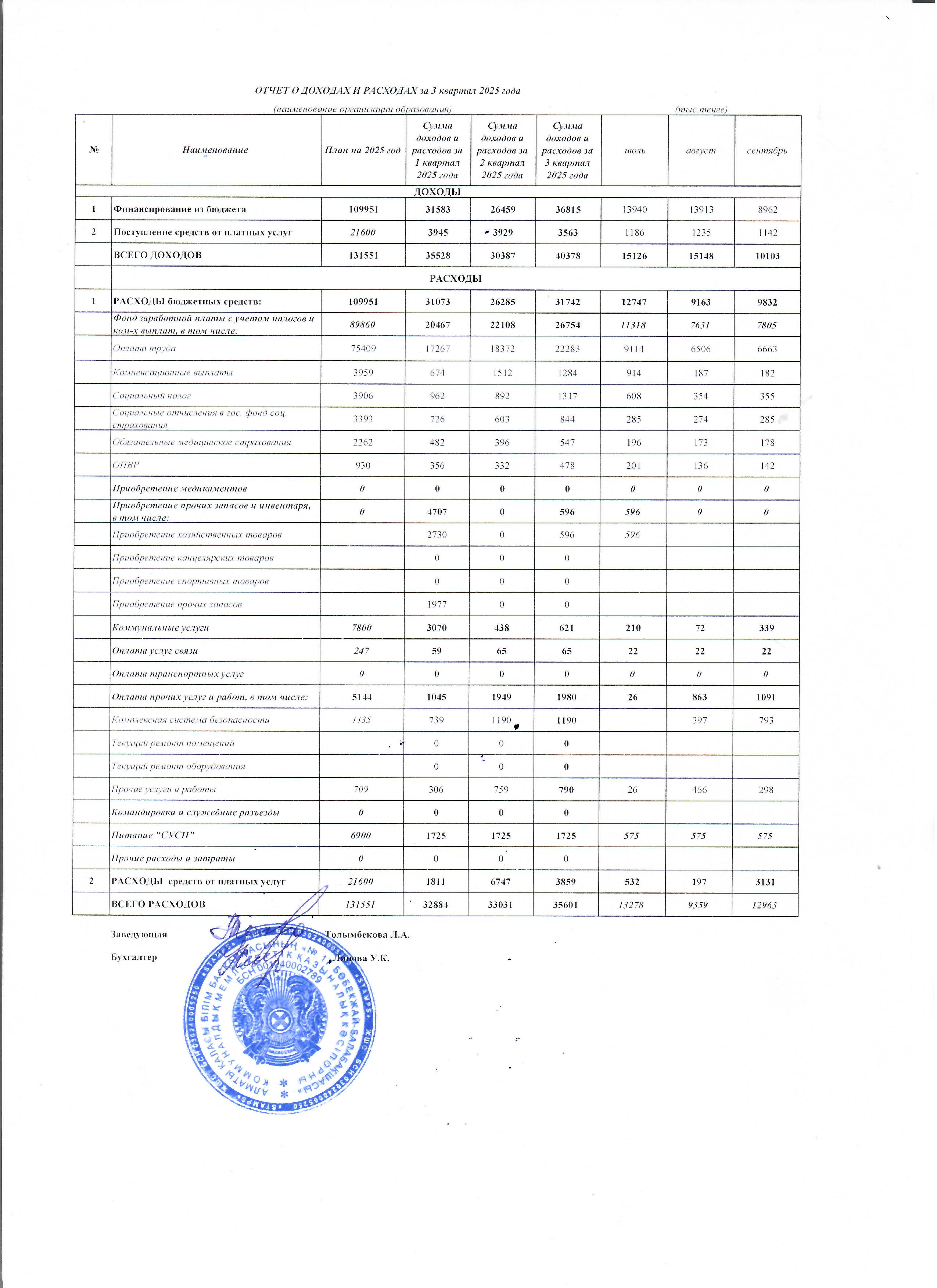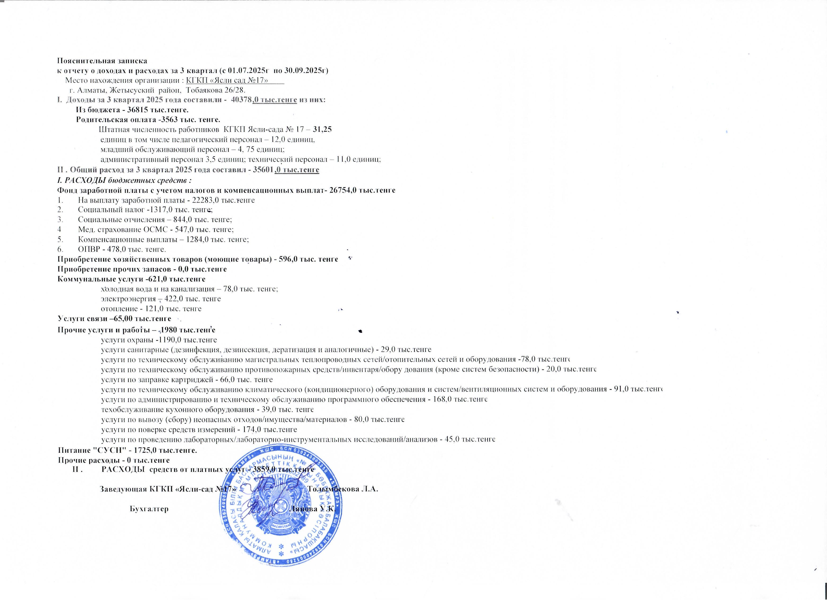 Кіріс және шығыс есебі 2025 жыл ІІІ-тоқсан. » ГККП "Ясли сад №17". Жетысуский район
